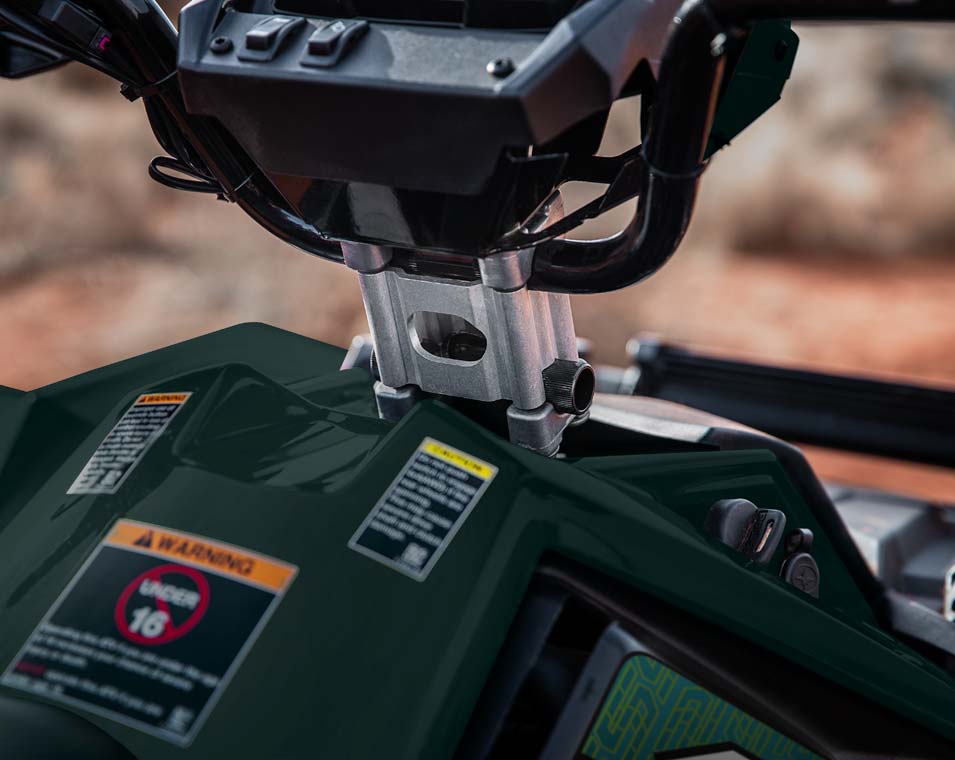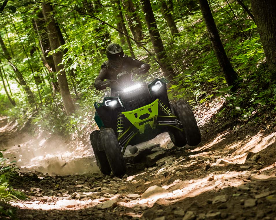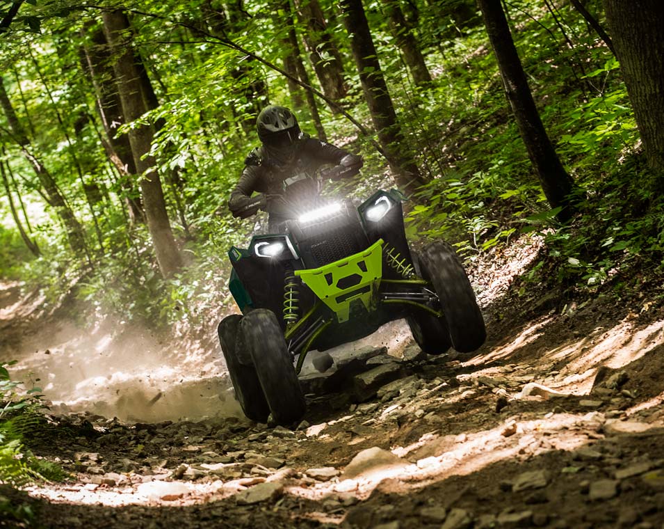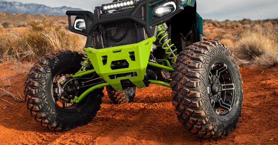 - 2 modes de conduite : Performance/Standard, Prise d'alimentation 12 volts, pré-câblée pour chauffe-mains et chauffe-pouces, port de chargement de batterie indépendant, Pare-chocs avant, plastiques peints, ressorts peints, élargisseurs d'ailes
